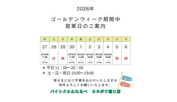 ゴールデンウィーク中営業日のご案内